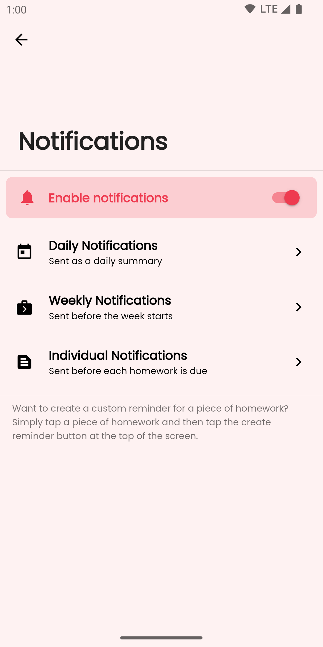 Simpliplan has a robust notification system. Get daily and weekly summaries, notifications for individual pieces of homework, and custom reminders! All are completely customisable; choose what works best for you.